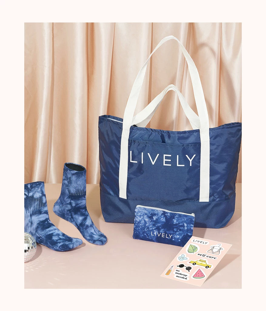 Join the jet-set with all of the must-have essentials of the season featuring the do-it-all Jet Set Drawstring Tote made of recycled materials, The Tie Dye Pouch, The Tie Dye Socks, and LIVELY stickers!